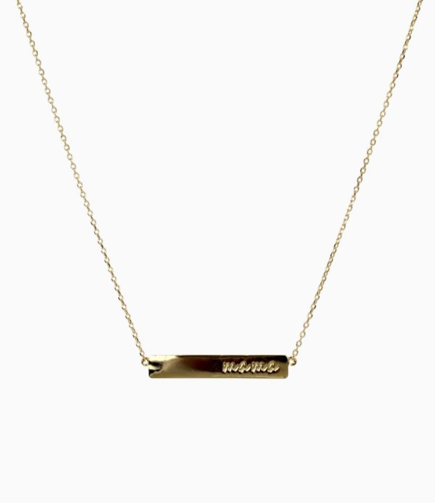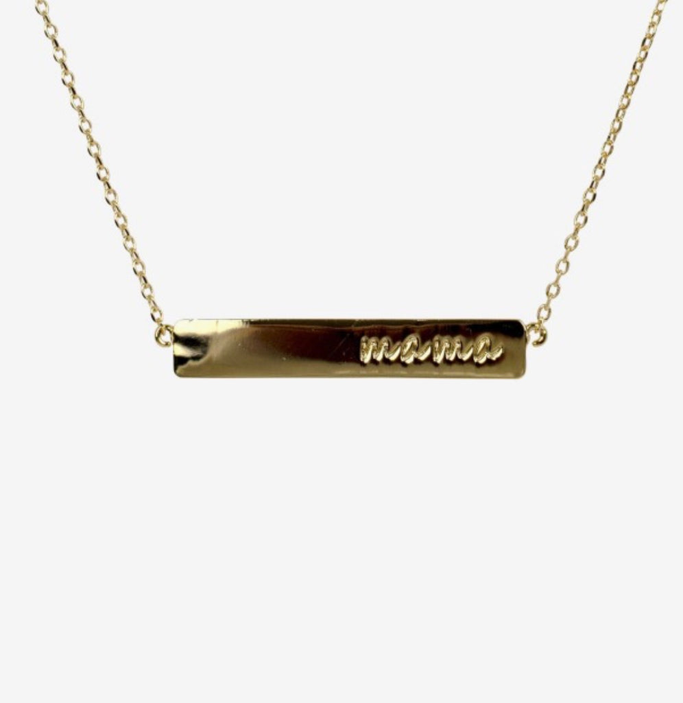 Elegant gold bar necklace celebrating motherhood. This modern pendant features a sleek rectangular design with "Mama" engraved in refined lettering, suspended from a delicate chain. Perfect for everyday wear or as a meaningful gift for the special mom in your life. Crafted to complement any style while honoring the strength and grace of motherhood.