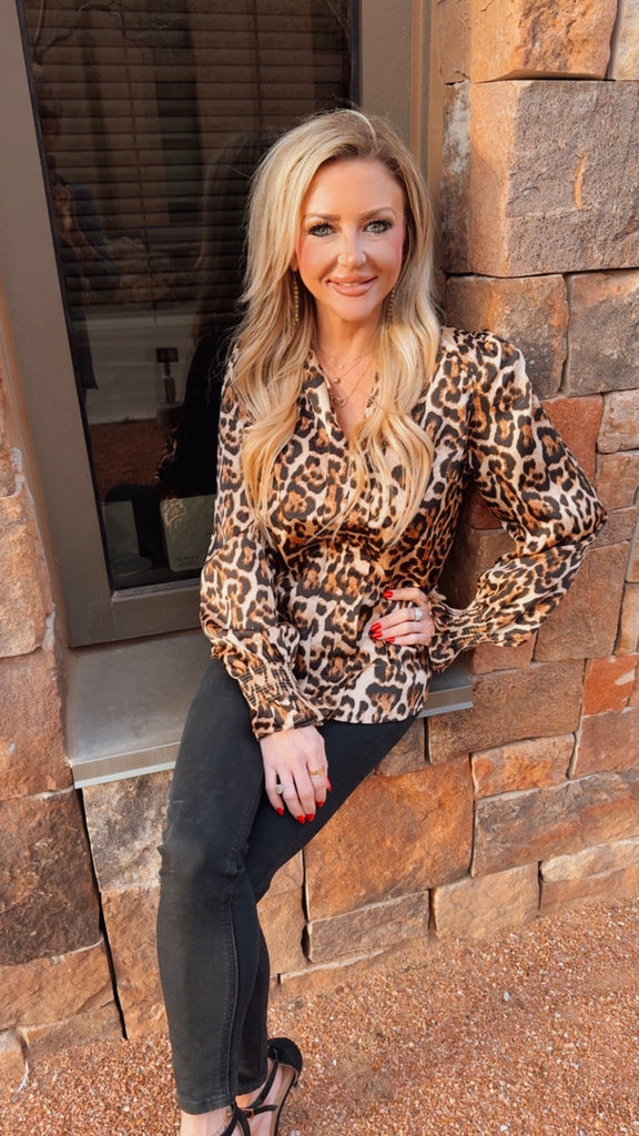 The Lainey Leopard Blouse makes a confident statement with its bold leopard print rendered in luxurious satin. The fluid fabric drapes beautifully, creating an elegant silhouette that works equally well dressed up or down. This pattern-forward piece serves as a versatile layering option or standalone statement top, allowing you to express individual style without sacrificing sophistication. Perfect for those ready to elevate their everyday looks with refined edge.