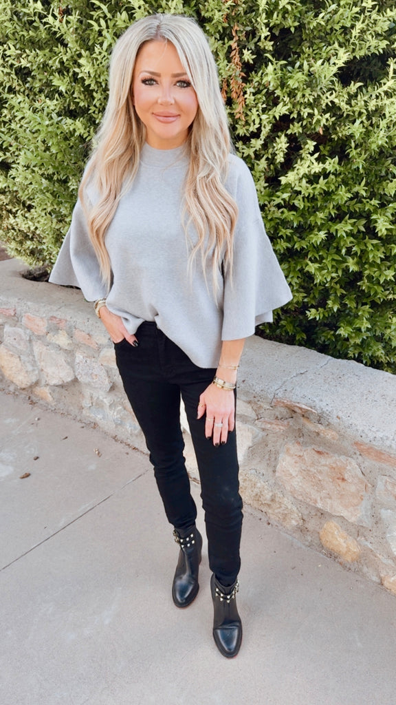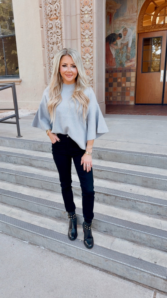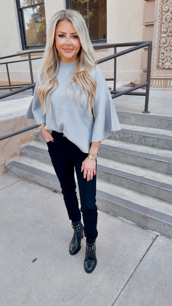 The Emma Sweater combines a soft viscose fabric with elegant bell sleeves and a high-low hem for a modern silhouette. Enhanced with a ribbed neckline and side slits, it delivers both comfort and refined style.