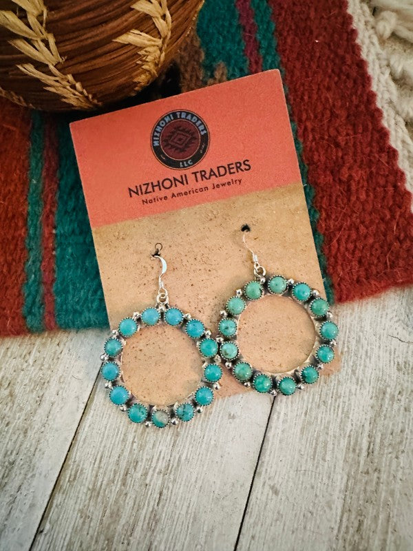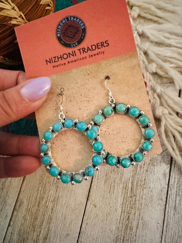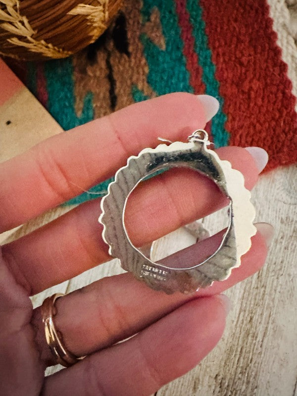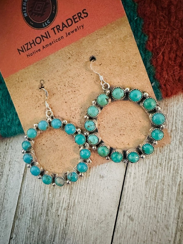 Gorgeous Navajo Turquoise and Sterling Silver dangle hoop earrings. Such a great pair for any collection! These beauties measure 1 3/4 inches long and 1 3/8 inches wide. Signed by the artist and stamped Sterling.