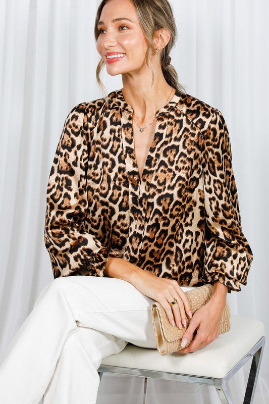 The Lainey Leopard Blouse makes a confident statement with its bold leopard print rendered in luxurious satin. The fluid fabric drapes beautifully, creating an elegant silhouette that works equally well dressed up or down. This pattern-forward piece serves as a versatile layering option or standalone statement top, allowing you to express individual style without sacrificing sophistication. Perfect for those ready to elevate their everyday looks with refined edge.